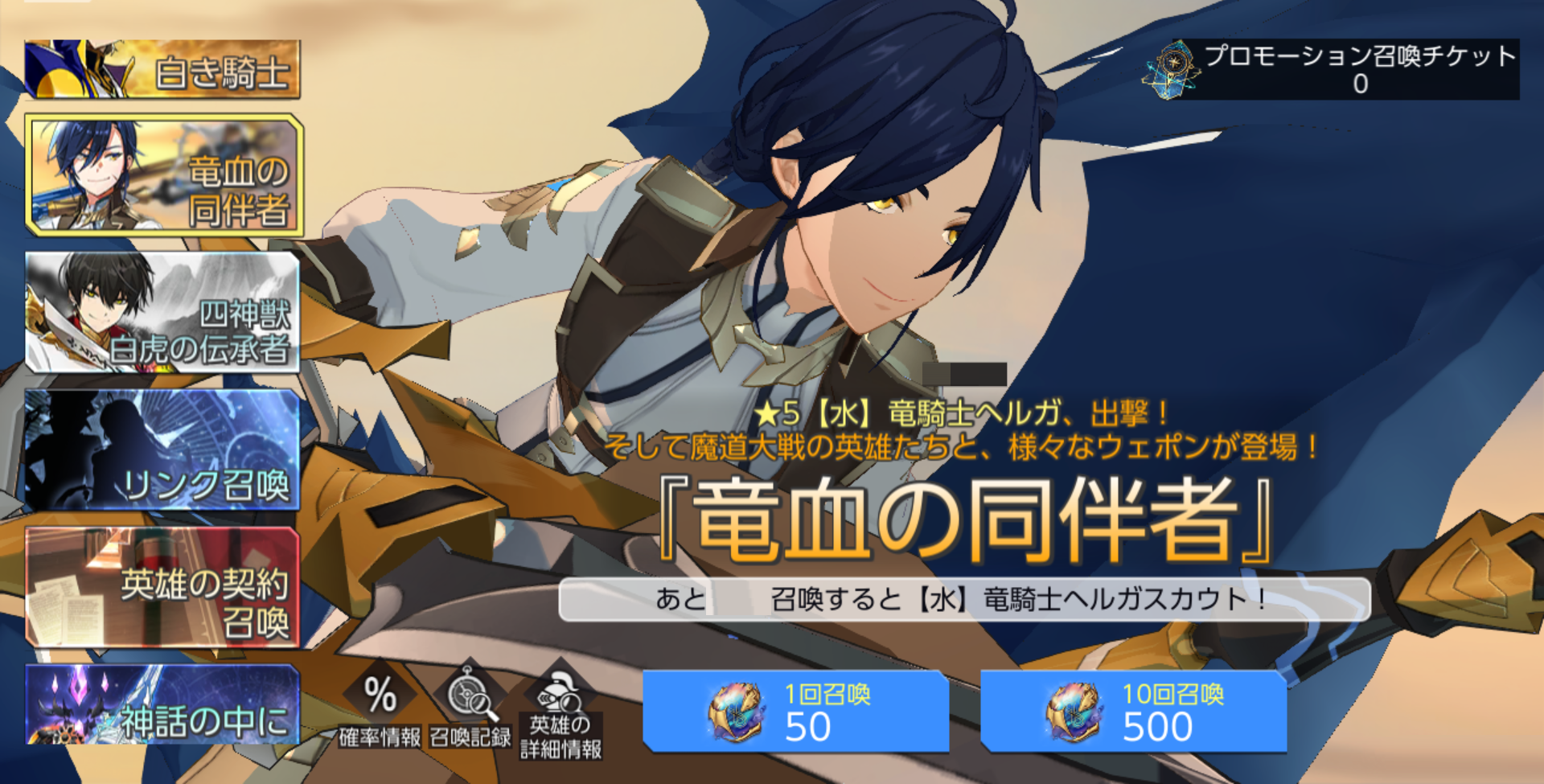 ※ 「竜血の同伴者」召喚で89回以上★5 【水】竜騎士ヘルガが登場しない場合、90回目の召喚で★5【水】竜騎士ヘルガが100%の確率で召喚されます。
