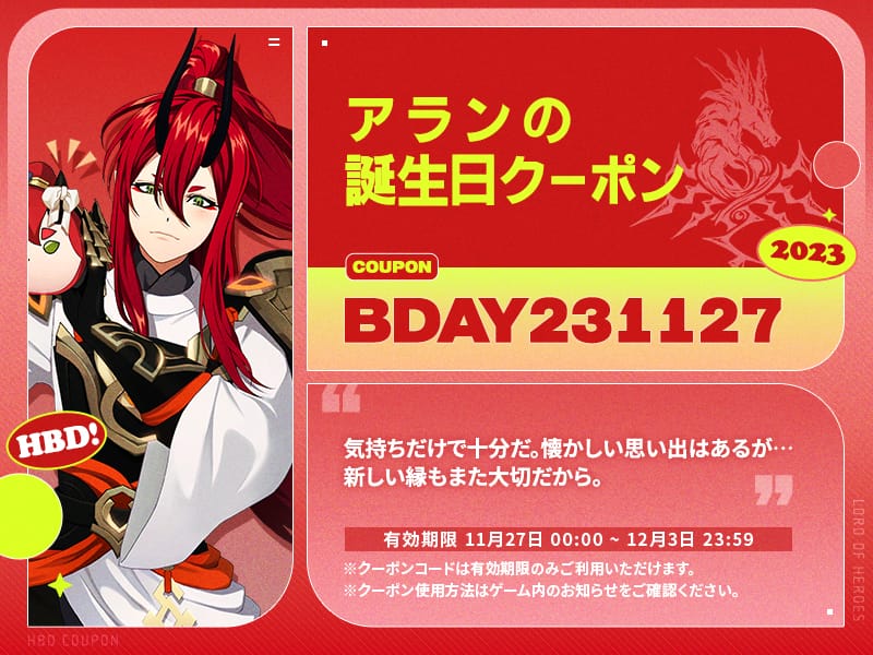 アランの誕生日を迎え、バースデークーポンを用意しました。
