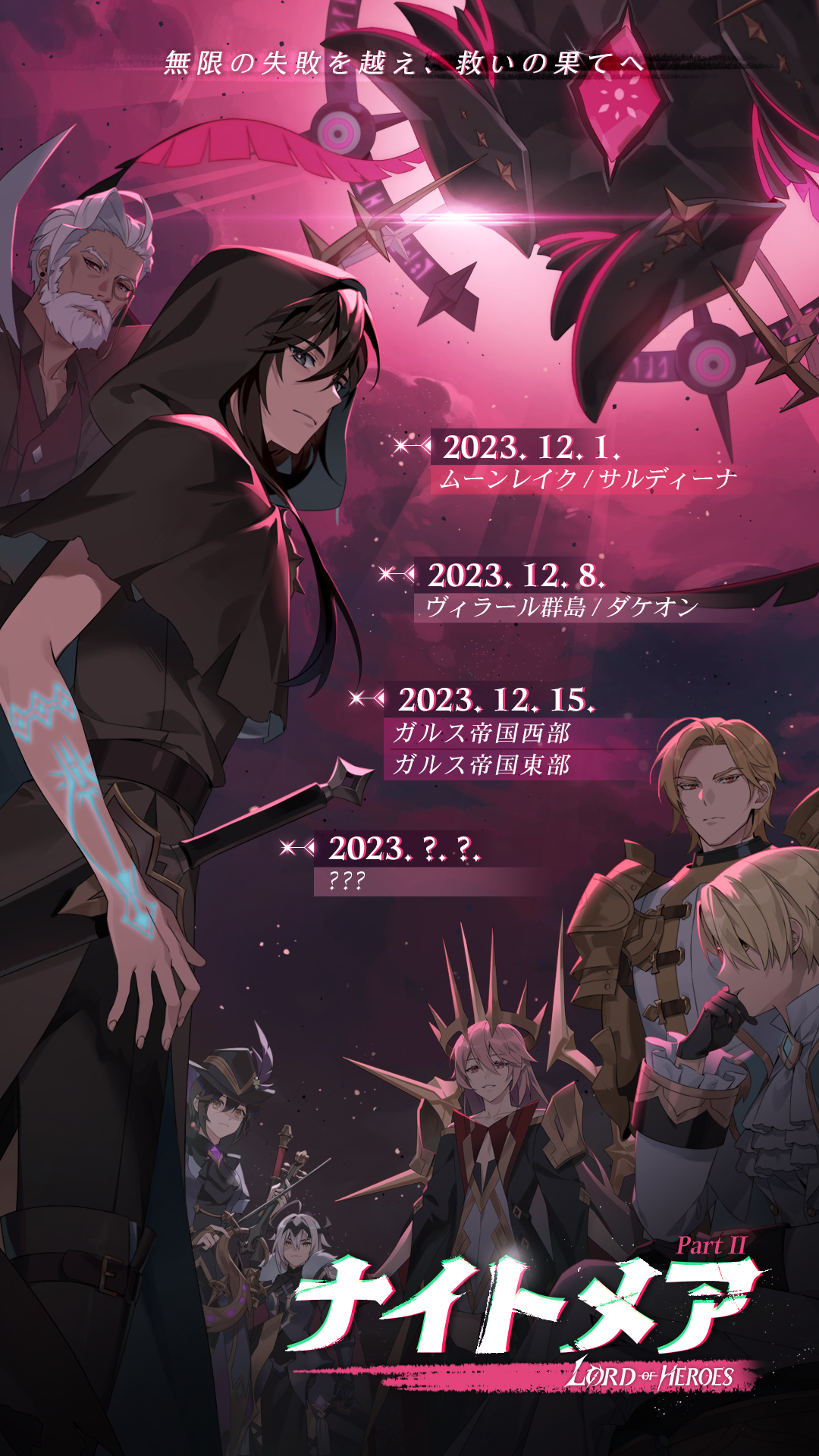 お知らせ ナイトメア Part ll - アップデートスケジュール 「ロードオブヒーローズ」運営チーム Read more posts by this author. 「ロードオブヒーローズ」運営チーム 2023年 12月 1日 金曜日 再びアヴァロンに襲いかかる悪夢が、毎週繰り広げられます!「ナイトメア」パートⅡでは、どんな事件が待ち受けているのでしょうか?12月、救いの果てまで、辿り着きますように。