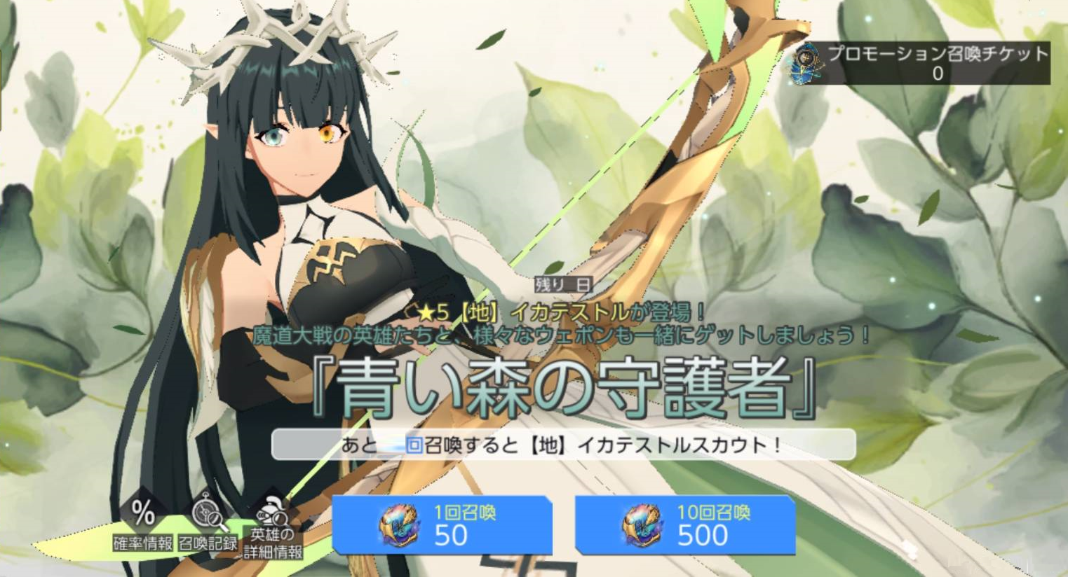 ※「青い森の守護者」召喚はプロモーション召喚商品です。プロモーション召喚商品は、他のプロモーション召喚商品と召喚累積回数が共有される場合があります。但し、他の召喚商品とは共有されませんのでご注意ください。※「青い森の守護者」召喚で獲得可能な英雄及びウェポンは召喚終了後、他の召喚を通して再入手可能になる場合があります。