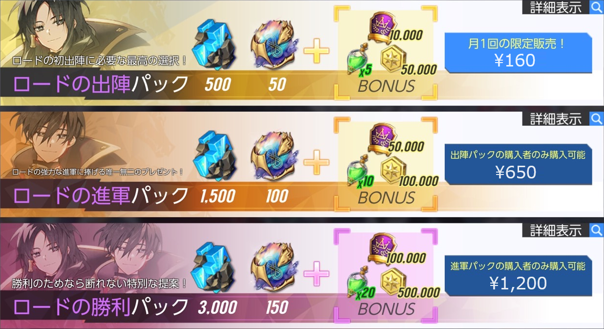 ※このパックは、前段階のパックを購入することで、次の段階のパックを購入していただけます。 (例:「ロードの出陣パック」購入後、「ロードの進軍パック」購入可能)