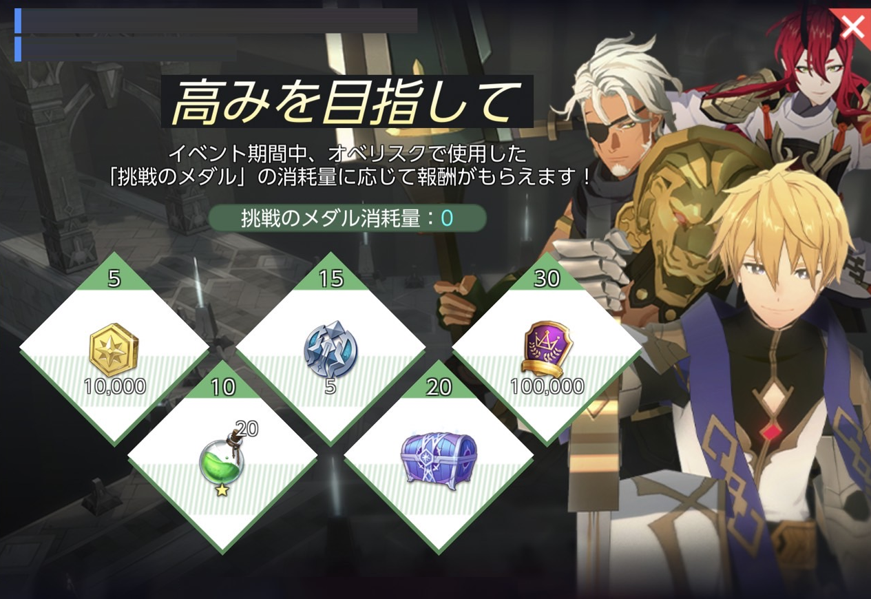 - イベント期間中、オベリスクで使用した「挑戦のメダル」の消耗量に応じて報酬がもらえます!