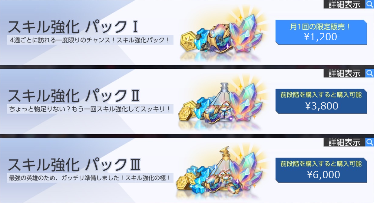 ※このパックは、前段階のパックを購入することで、次の段階のパックを購入していただけます。 (例:「スキル強化パックⅠ」購入後、「スキル強化パックⅡ」購入可能)
