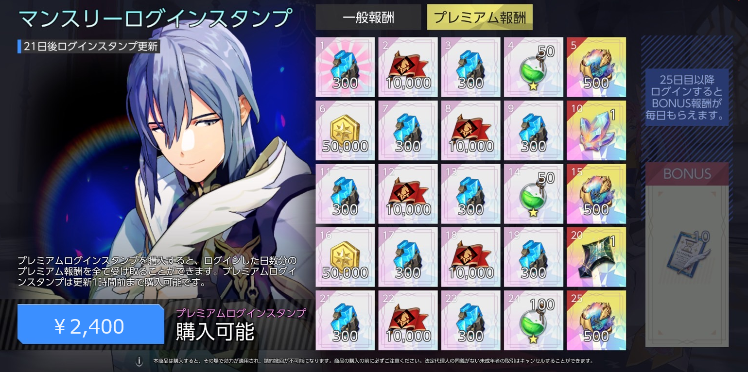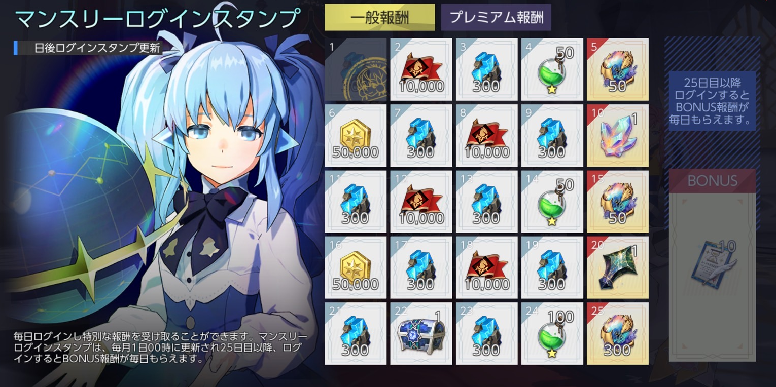 ※ログインスタンプの報酬は「一般報酬・プレミアム報酬」で構成されており、25日目以降にログインすると、毎日BONUS報酬を獲得することができます。