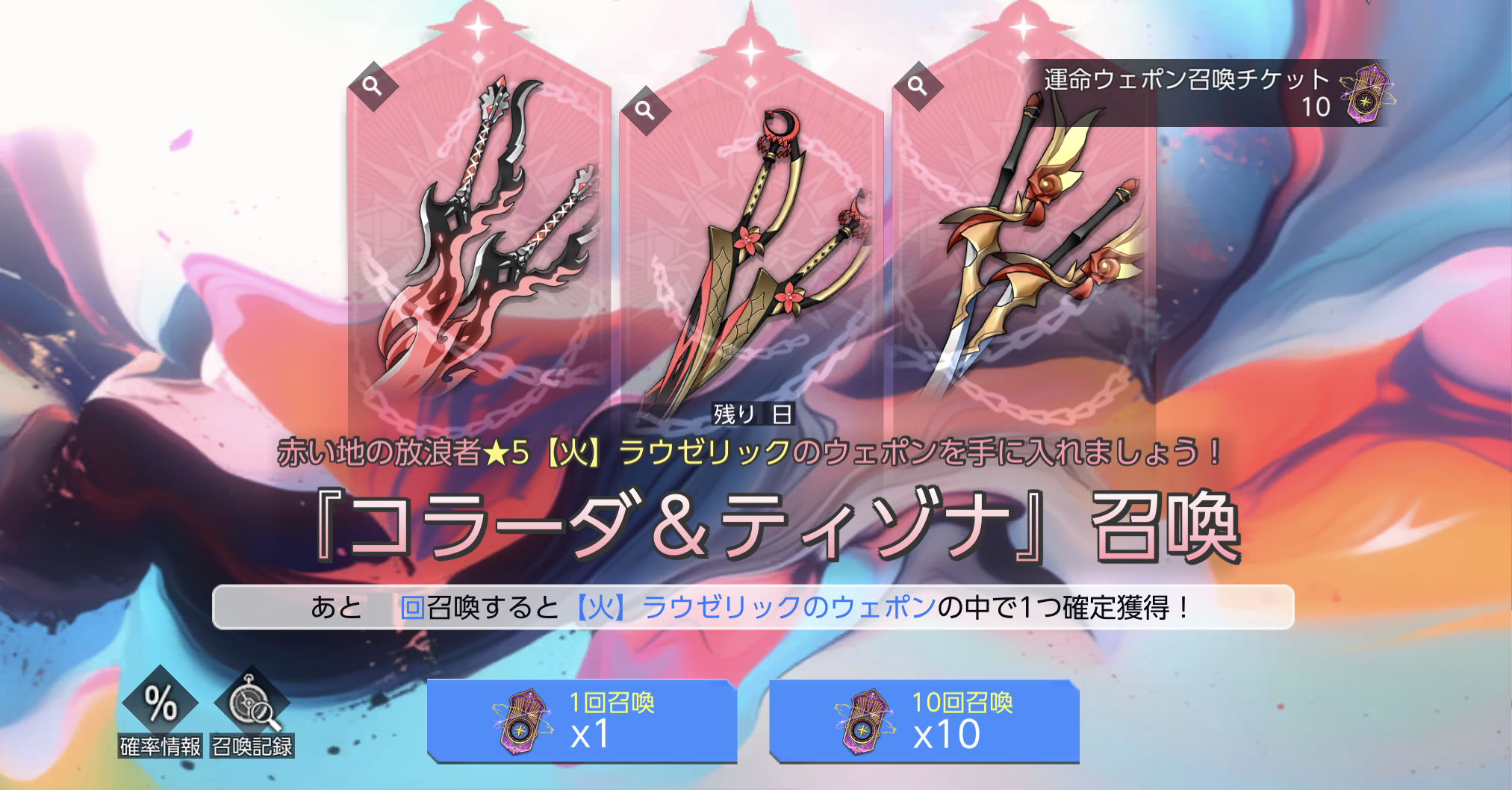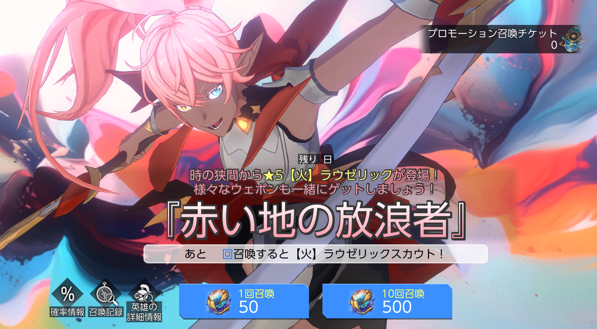※ 「赤い地の放浪者」召喚で89回以上★5【火】ラウゼリックが登場しない場合、90回目の召喚で★5【火】ラウゼリックが100%の確率で召喚されます。