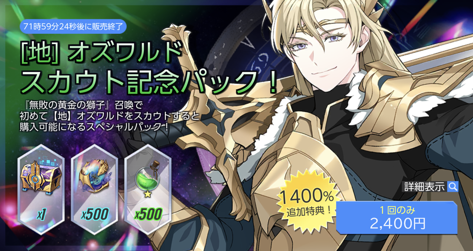 ※既に【地】オズワルドをスカウトしている場合、召喚で【地】オズワルドを再度スカウトした場合のみパックが購入可能になります。