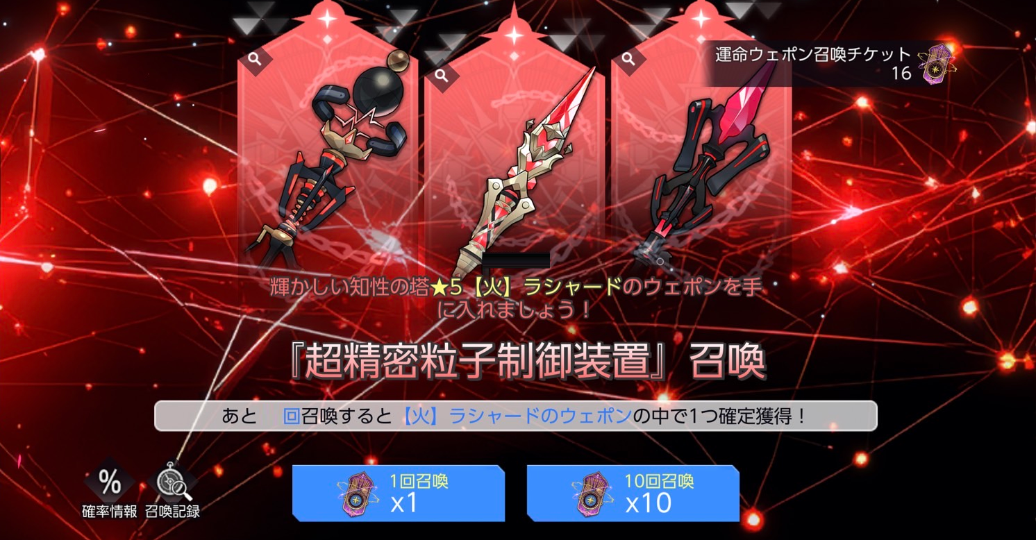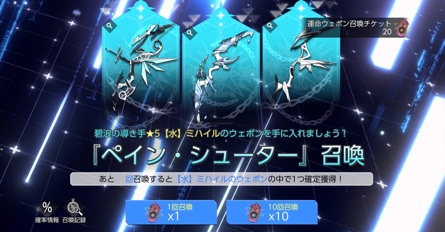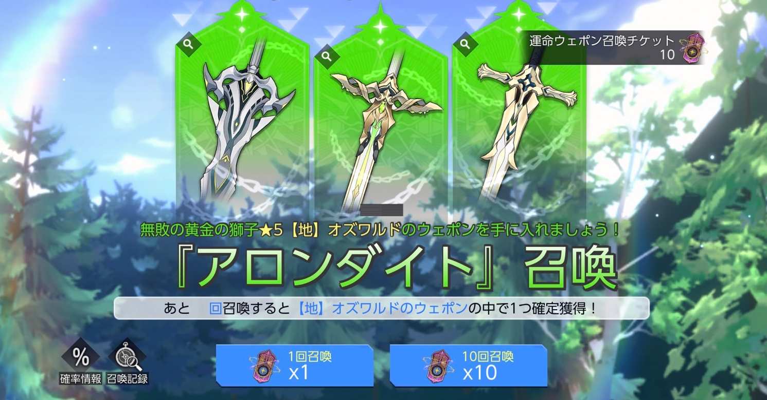 ※ウェポン召喚時の登場確率:ノーブルウェポン(25.0000%) / レリックウェポン(25.0000%) / ウェポン(50.0000%)の確率が適用されます。