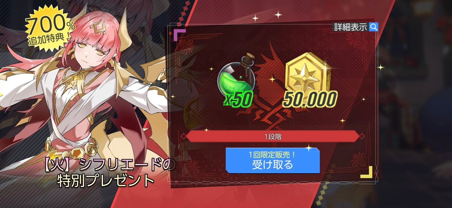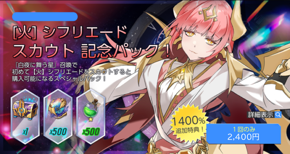 ※『白夜に舞う星』召喚で新英雄である【火】シフリエードをパック販売期間中に初スカウトすると購入可能になるパックです。