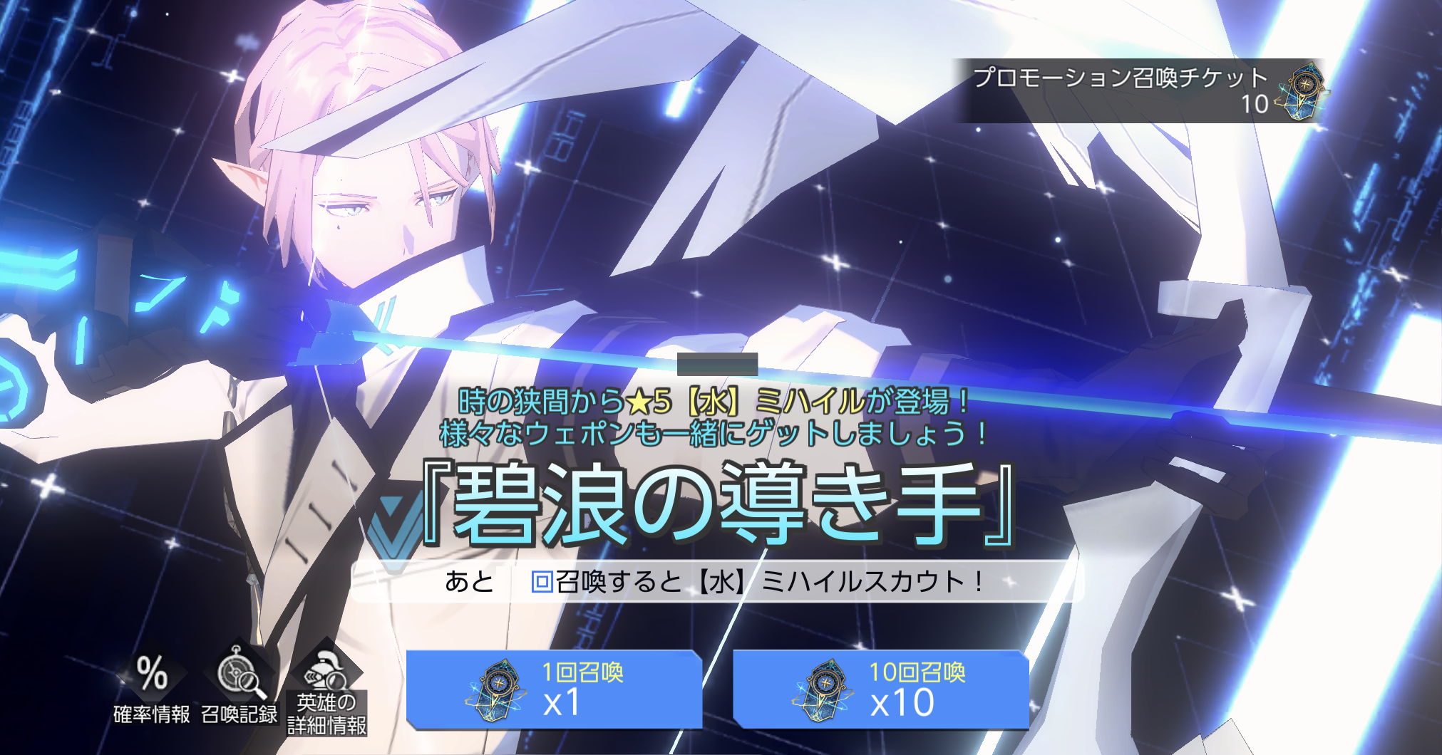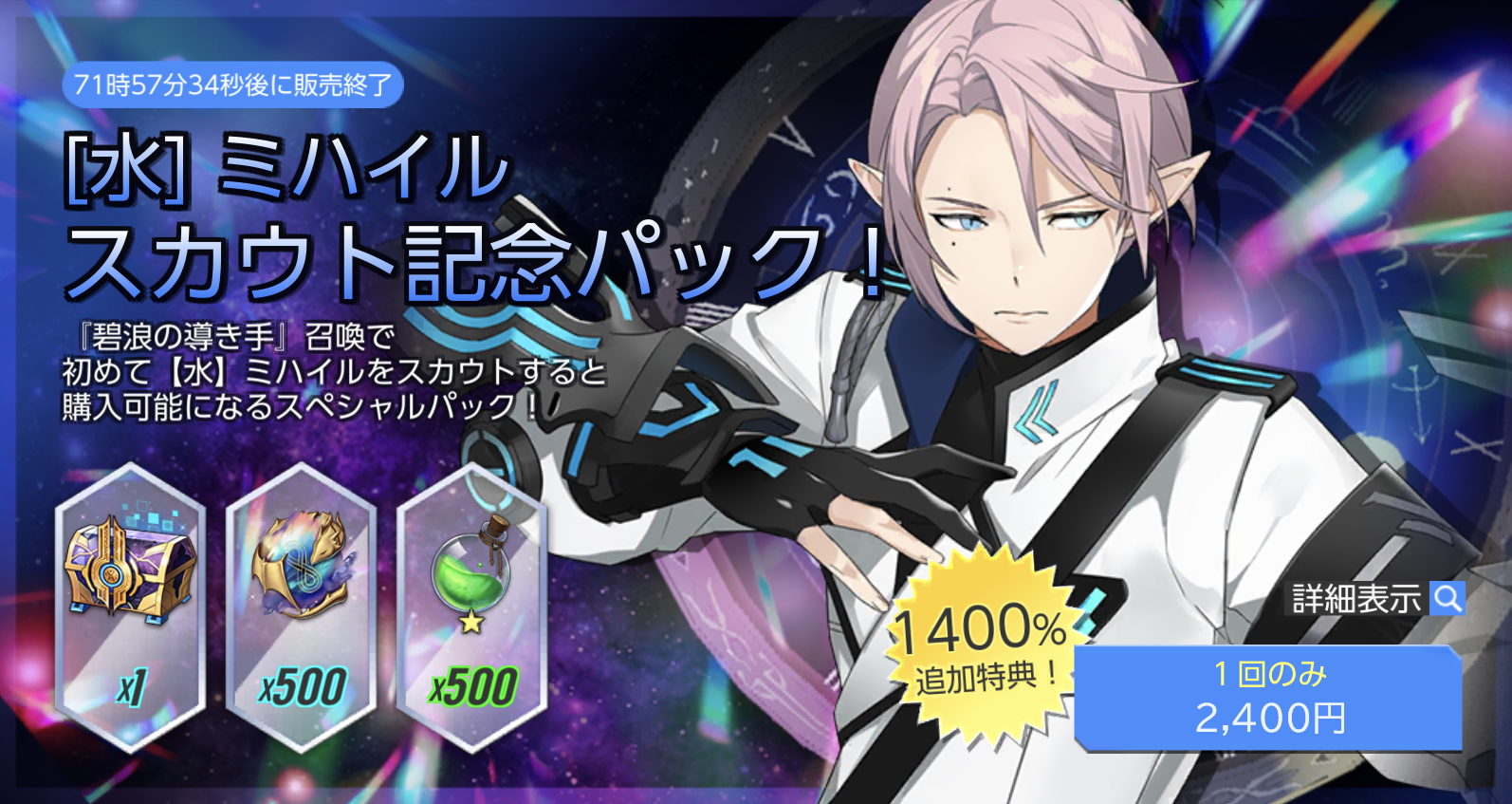 ※『碧浪の導き手』召喚で新英雄である【水】ミハイルをパック販売期間中に初スカウトすると購入可能になるパックです。