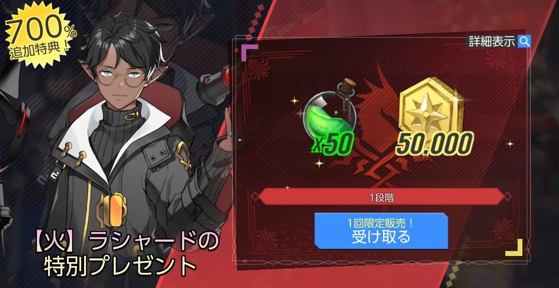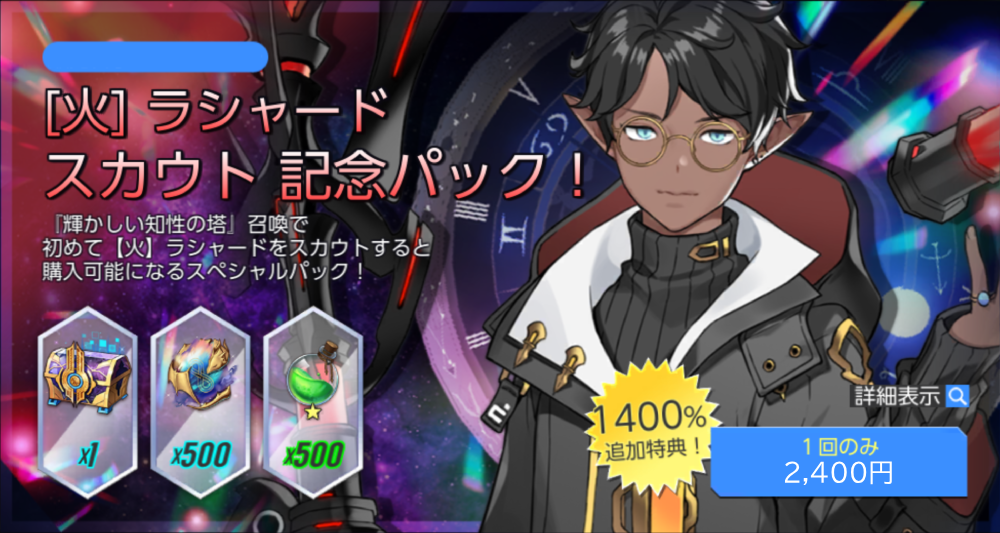 ※既に【火】ラシャードをスカウトしている方は召喚で【火】ラシャードを再度スカウトした場合のみパックが購入可能になります。