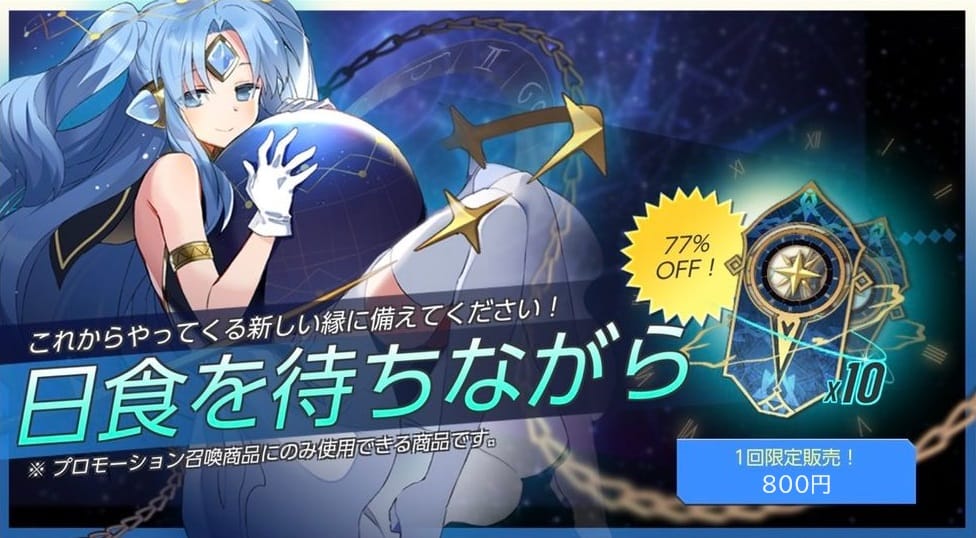 - 「日食を待ちながら」パックをご購入いただくと、プロモーション召喚チケット10枚を「プレゼントボックス」内にある「ショップ」のタブから獲得できます。