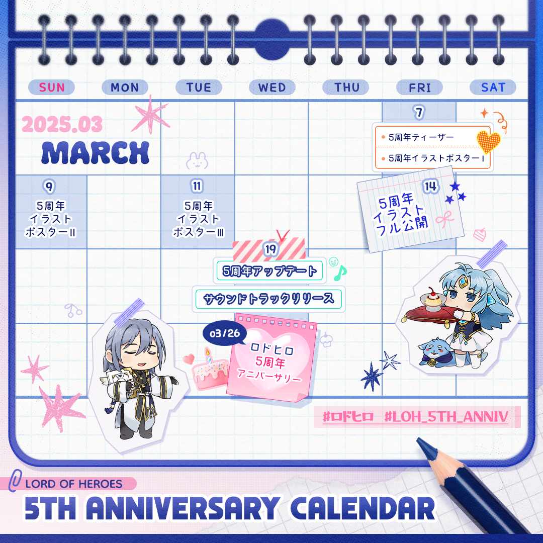 お知らせ 【お知らせ】ロドヒロ5周年プロモーションカレンダー 「ロードオブヒーローズ」運営チーム Read more posts by this author. 「ロードオブヒーローズ」運営チーム 2025年 3月 3日 月曜日 5年間、たくさんのご声援を届けてくださったロードの皆さまへ。感謝の気持ちを込めて、ご用意しました!💖3月もロードオブヒーローズとともに、素敵な時間をお過ごしください!#ロドヒロ #LOH_5TH