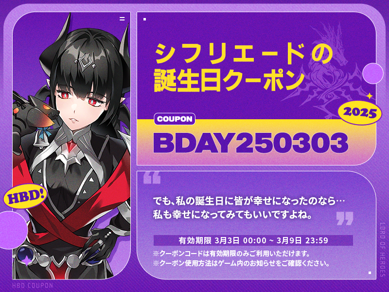 シフリエードの誕生日を迎え、バースデークーポンを用意しました。