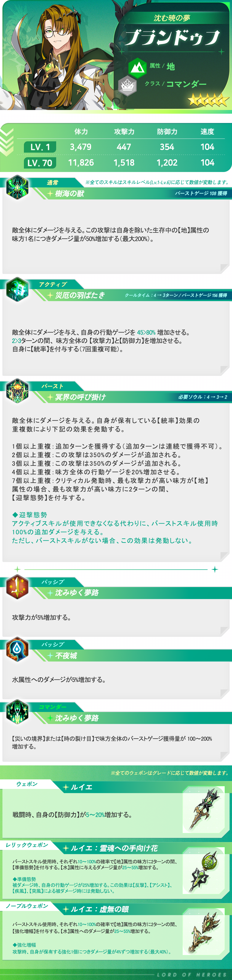 生まれながらにして王国の後継者であったブランドゥフは、正しき道を探し出し、人々を導き、王としての使命を全うするために、立ち止まることなく行動し続けた。あらゆる分野に精通するために理論をしっかりと学び、養母であり師でもある大魔道士リリアンの導きのもと、限界をも超越する魔法に目覚めた。最も驚くべきことは、すべてを完璧にこなしながらも、一度も不満を口にしなかったことだ。生まれ持った器の大きさと温かな品格が、彼を「王たる者」へと形作ったのだ。それだけにはとどまらない。ブランドゥフは毎日この世界に、いやこの宇宙の摂理に感謝していた。守るべき者たちを支えられるということが、彼にとっての喜びだったのだ。