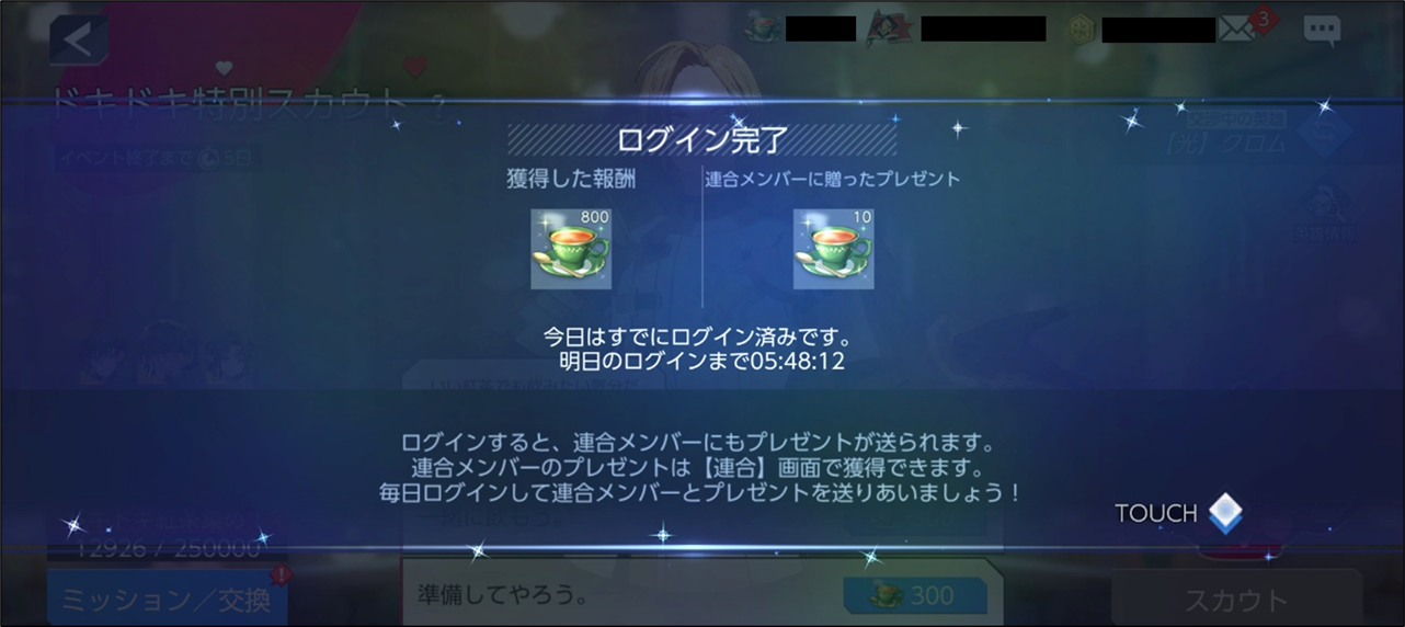 - 毎日ログインして「ドキドキ特別スカウト」画面に入ると、「温かい紅茶」を獲得できます。また、同じ連合に所属しているメンバーにもプレゼントとして、一定数の「温かい紅茶」が支給されます。