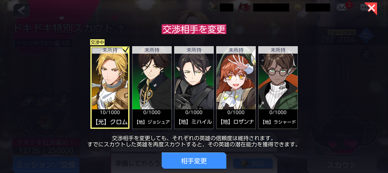 - 交渉中の英雄は、画面右上のアイコンから変更できます。
