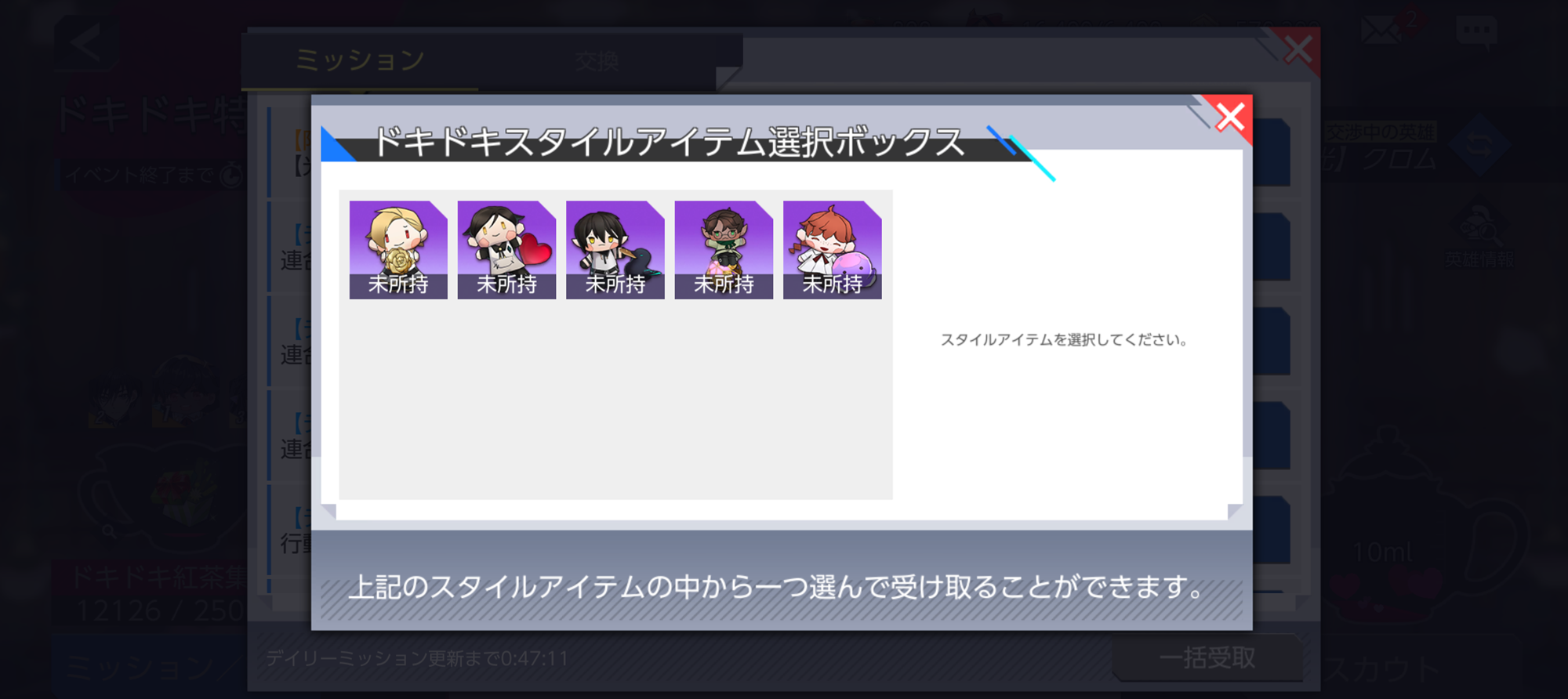 - 通算信頼度を獲得するミッションをクリアすると、登場する英雄ごとのスタイルアイテム(レプリカランク)を選んで受け取れるボックスを報酬として獲得できます。