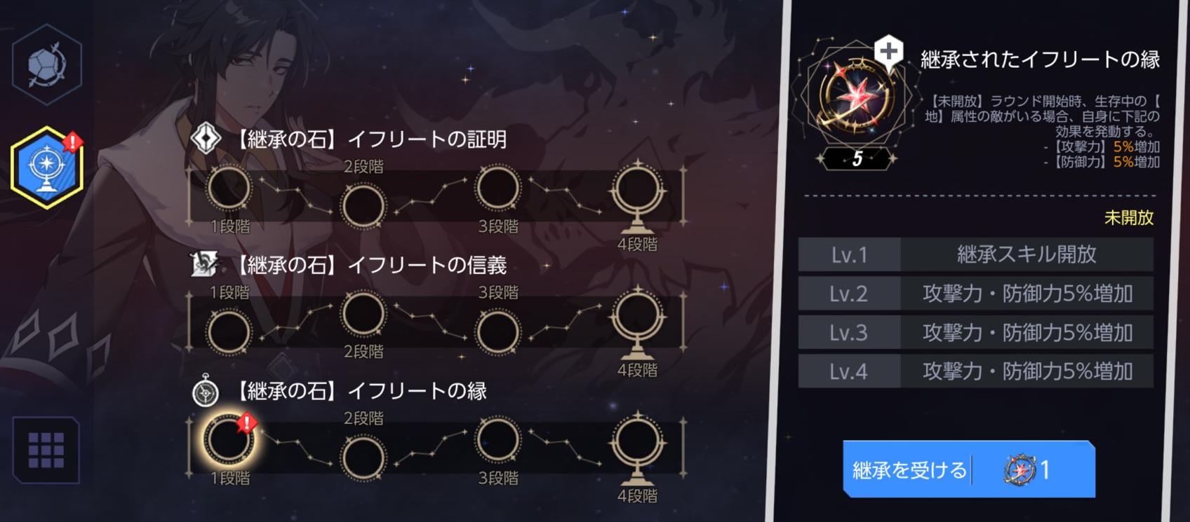 - 継承の石を使用することで、同じ属性の英雄に「継承スキル」を開放させることができます。