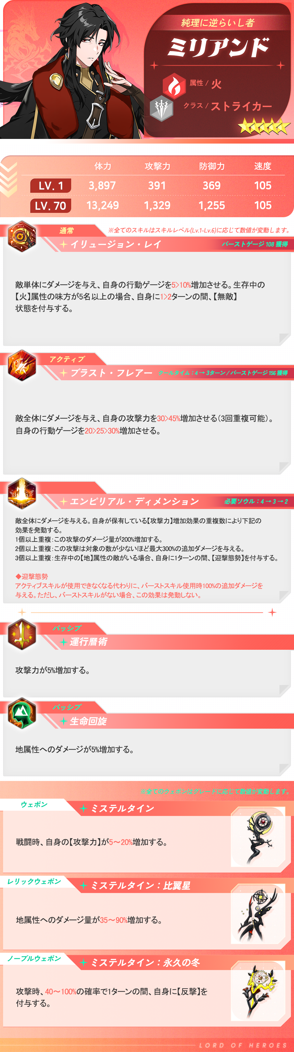 旅の途中で数多くの技術を磨き、自身のアイデンティティを魔法使いではなく医者として確立した後、ミリアンドは二度の縁に恵まれた。最初は快く姓を与えてくれた太古の光であり家族、その次には最後の戦いを共にした仲間たちだった。彼はいつでもどこでも群れに混ざることを拒み、自分の意志が全てであるかのように動いたが、彼が何よりも優先したのは仲間の命であり、その手の中に無益なものは一度もなかった。