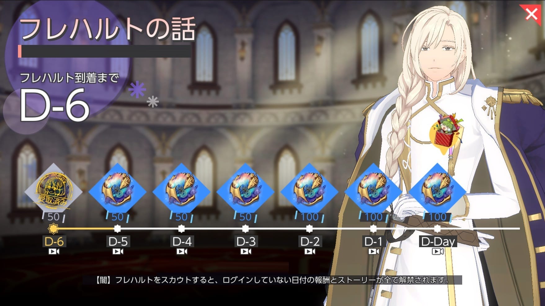 ※カウントダウンログインスタンプ終了後にフレハルトをスカウトした場合は、ストーリーは解禁されません。