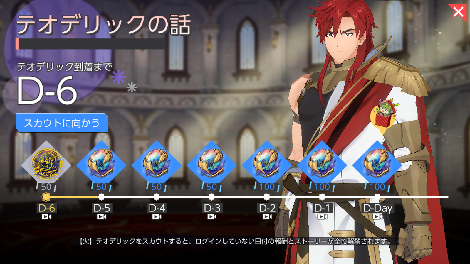 ※カウントダウンログインスタンプ終了後にテオデリックをスカウトした場合は、ストーリーは解禁されません。